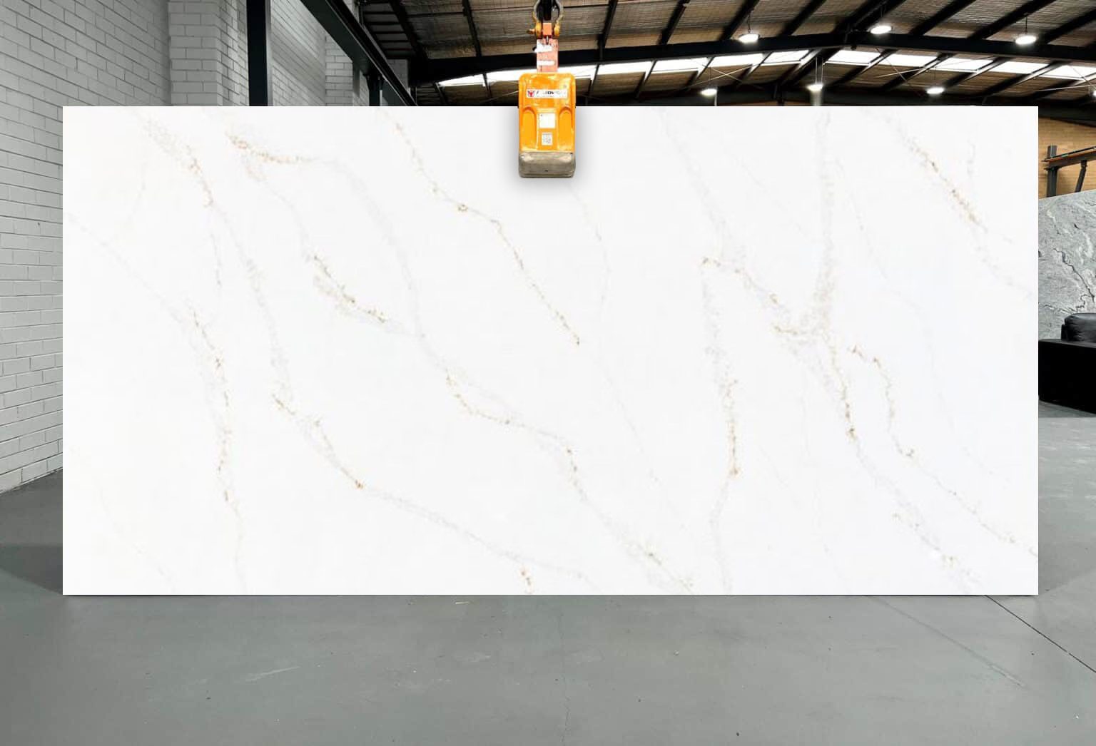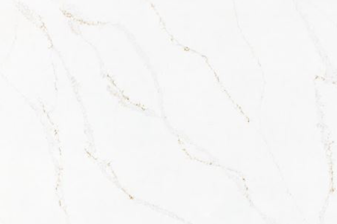 Bellini Grey quartz features a white background with soft grey and gold veining to create an enticing Calacatta Marble inspired design. This is an excellent choice if you want your countertops to make a sophisticated statement with a bit of unique personality.