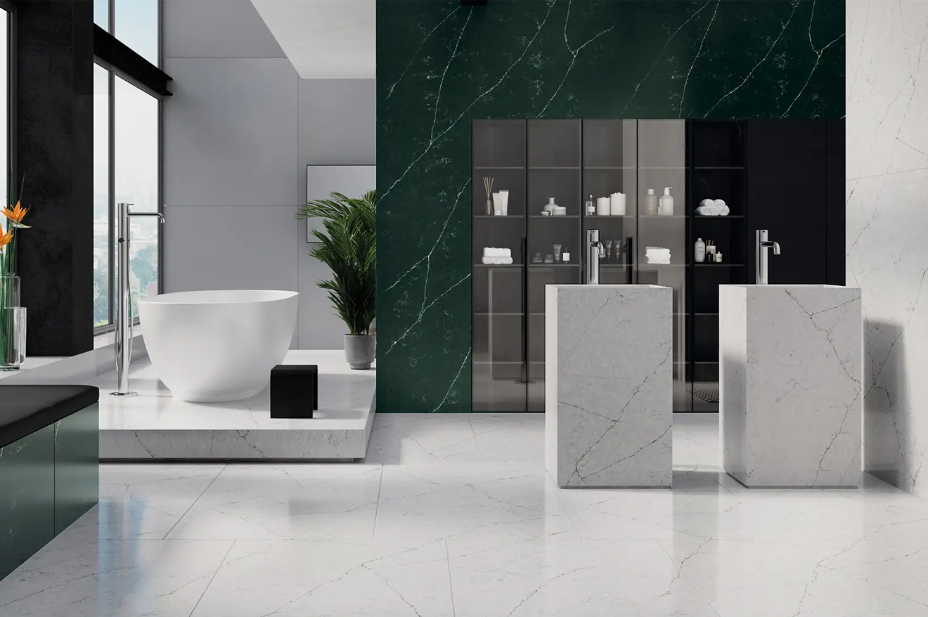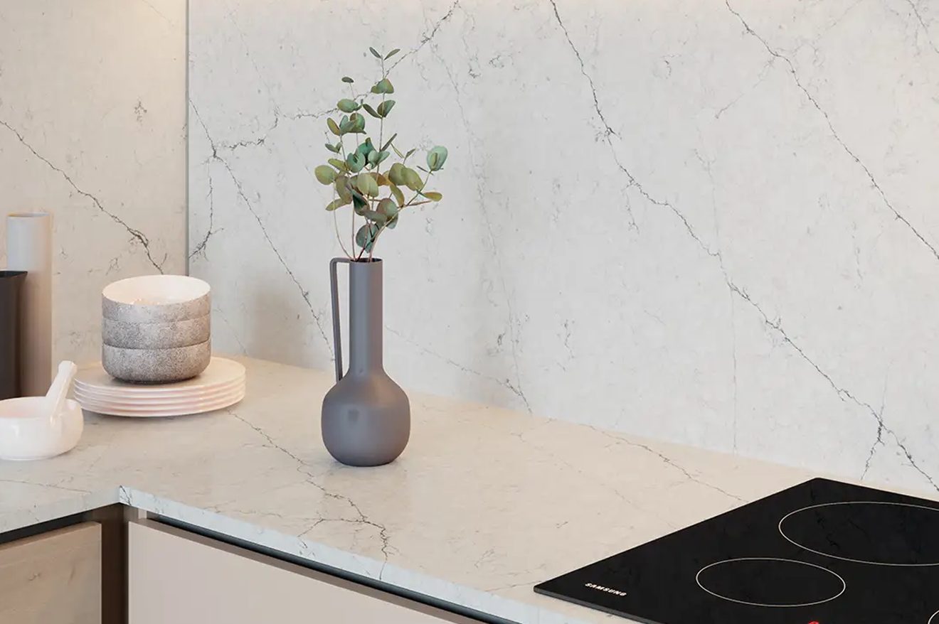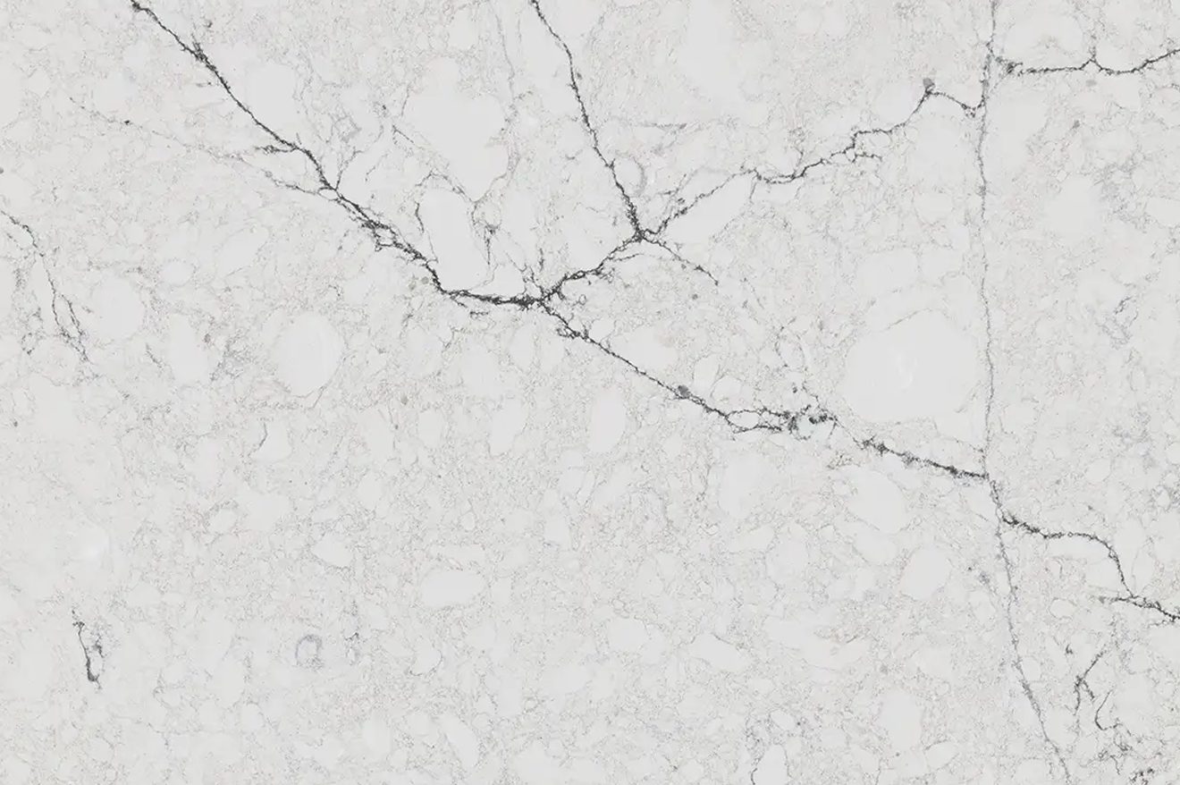 Betulla quartz presents an ivory background with grey veining pattern to exhibit a rustic visual suitable for commercial and domestic designer spaces.