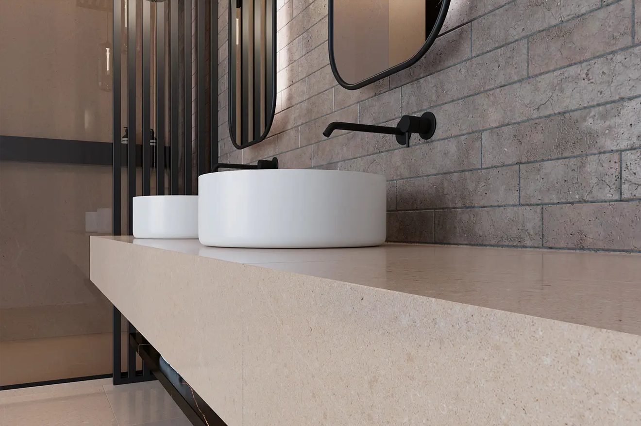 With a surface resembling golden hues of sand, Saturn quartz is an ideal match for specially designed spaces with the elegant combination of beige background and white pattern.