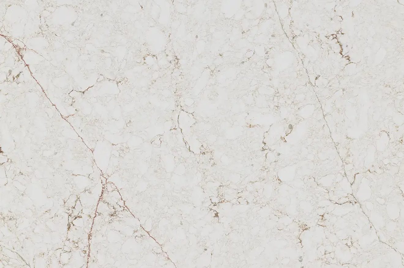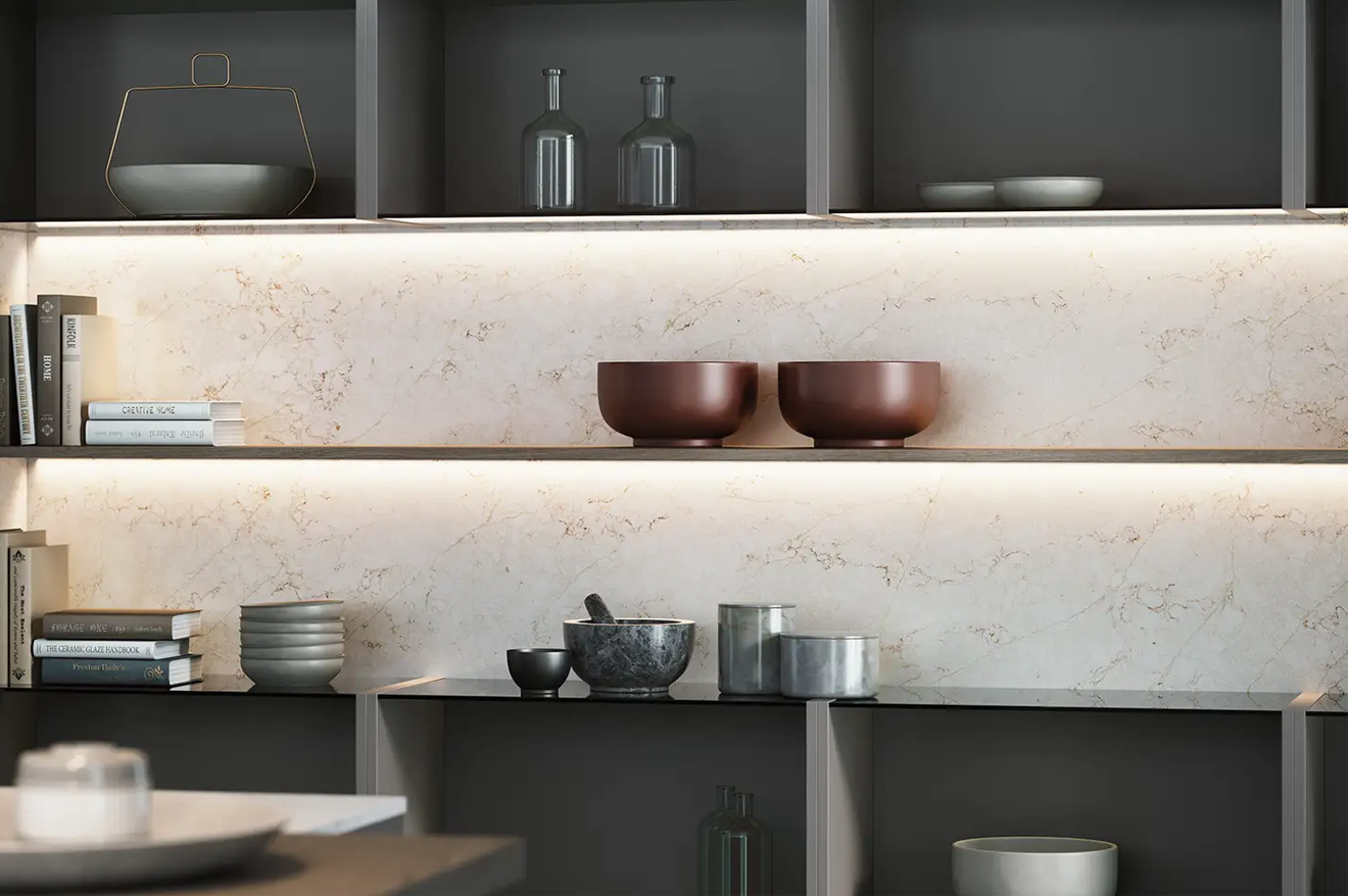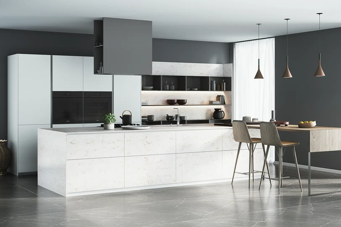 Sughero quartz presents an ideal surface with white background and golden pattern to exhibit a versatile and contemporary aesthetic for a modern home.